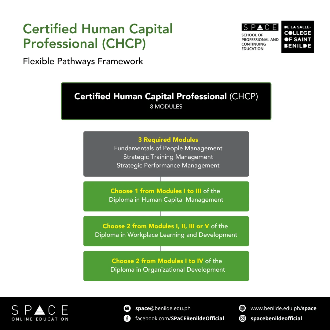 The Certified Human Capital Professional (CHCP) credential shall be bestowed upon students of SPaCE who complete eight (8) modules, representing a good mix of selected courses from the three (3) core diploma programs under the Human Capital Development cluster.
